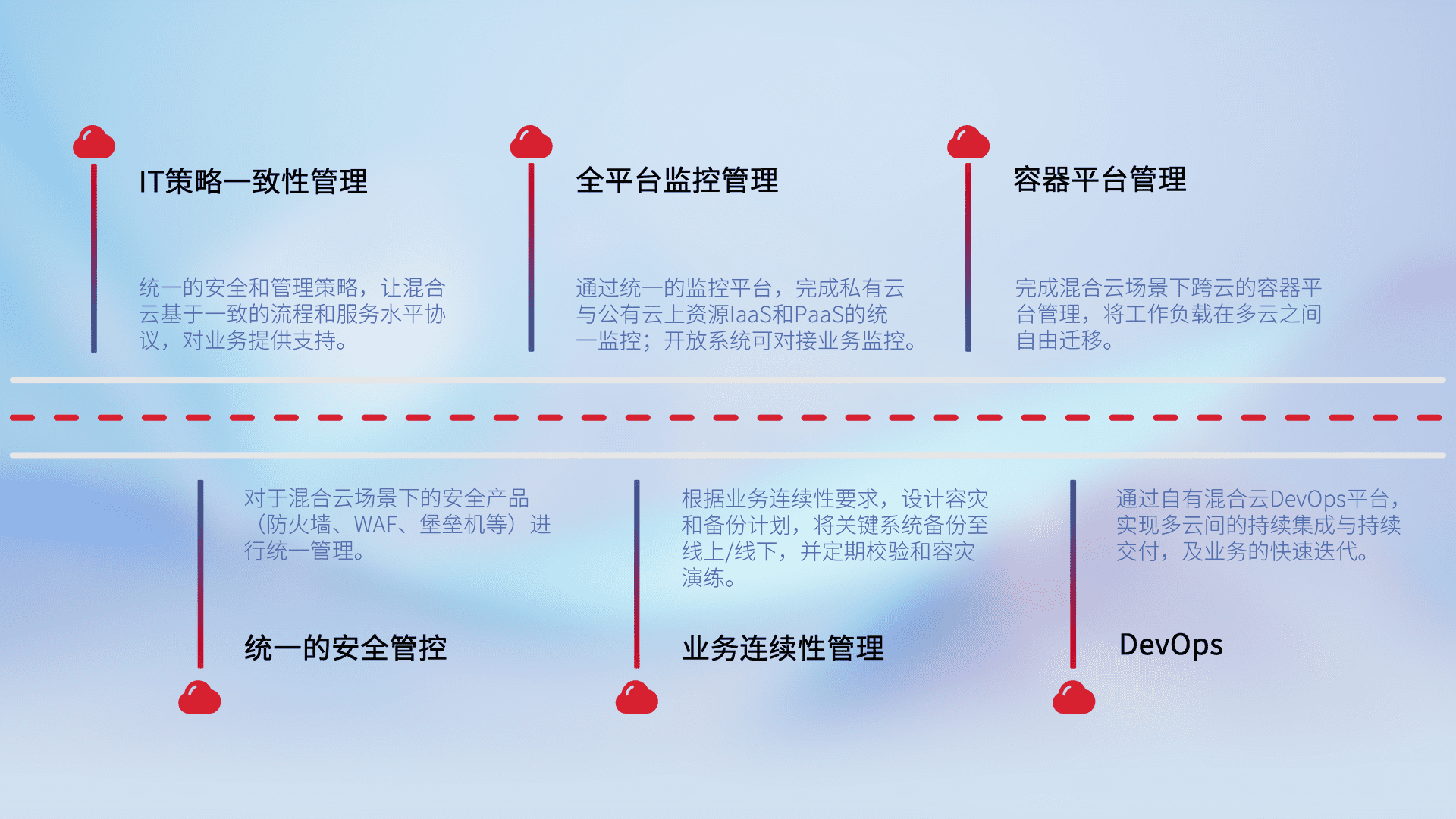 通过多云纳管,,以统一的资源数据模型把客户的云资源进行抽象和封装,,,,进而实现对多云资源的统一操作,,,,保障云资源管理的可靠性、、稳定性与可用性。。。。量身定制化运维内容,,,配置、、开发运维、、、补丁管理、、、、备份、、、监控、、、认证和访问管理、、、审计和日常巡检等,,,,保障在用云过程中的可靠度,,,,稳定度以及高可用率。。。。